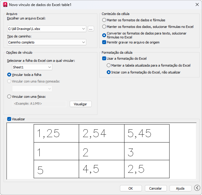 Vincula toda a folha especificada dentro de seu arquivo Excel com uma tabela em seu desenho.
