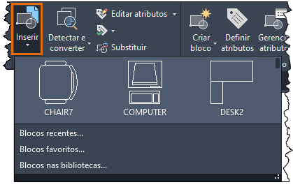 Galeria da faixa de opções – Na guia Início, painel Blocos, é possível clicar em Inserir para exibir uma galeria de definições de bloco no desenho atual. Use a galeria quando você tem um número pequeno de blocos para inserir rapidamente clicando neles e colocando-os no desenho.