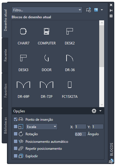 DesignCenter – A janela DesignCenter foi projetada para navegar e selecionar uma variedade de definições de desenhos existentes e bibliotecas de desenhos. Essas definições incluem blocos, camadas, tipos de linha e outros conteúdos. O DesignCenter fornece uma forma rápida e visual de arrastar e soltar blocos do desenho atual ou de outro desenho. Clique duas vezes nos nomes dos blocos para especificar a localização, a rotação e a escala precisas dos blocos. É possível acessar a janela do DesignCenter com o comando ADCENTER.