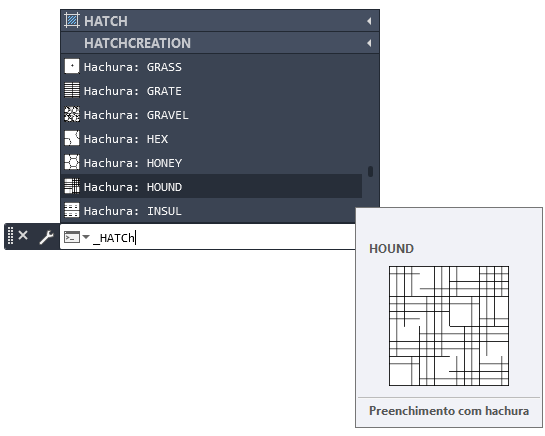 Exemplo: suponha que você deseja inserir um padrão de hachura. Se você digitar hachura no prompt de comando e pressionar a tecla Tab para navegar entre as opções, a lista de sugestões da linha de comando se expande para incluir padrões de hachura disponíveis. Arraste a barra de rolagem para exibir mais hachuras e gradientes. É possível ver uma miniatura de cada opção ao passar o cursor sobre o nome.