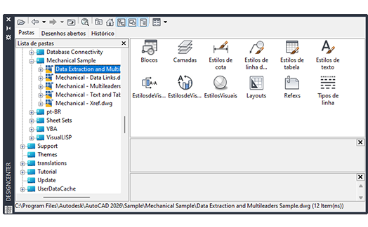 Exibe arquivos em seu computador e nas unidades de disco da rede, uma lista de desenhos abertos e um histórico dos últimos locais acessados. Selecione um item na vista em árvore para exibir seu conteúdo na área de conteúdo.