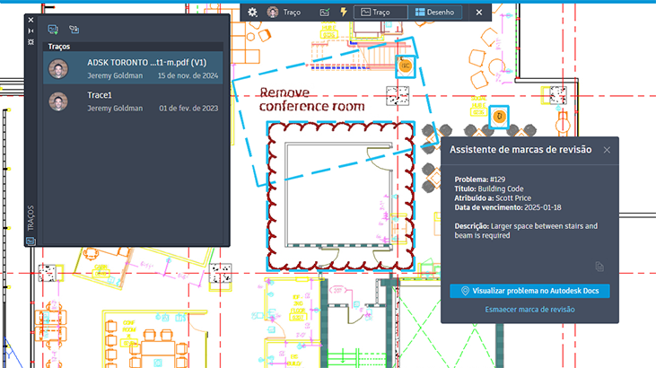 Os usuários do Autodesk Docs agora podem compartilhar uma URL de um layout ou da guia Modelo com os colaboradores, que podem adicionar marcas de revisão a um traço no AutoCAD na Web usando as ferramentas de marca de revisão do Autodesk Docs. Esse aprimoramento permite que vários colaboradores compartilhem desenhos com facilidade e adicionem marcas de revisão e revisões.