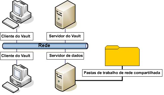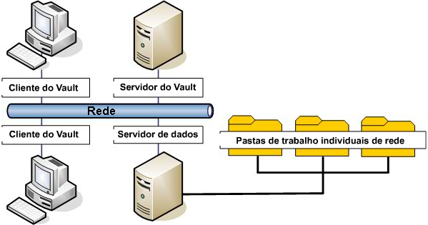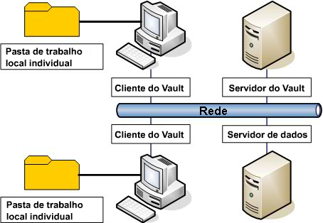 Quando as pastas de trabalho são mantidas nos computadores locais, como mostrado na Figura 7, ele minimiza o tráfego de rede e acomoda os membros da equipe que podem trabalhar off-line do campo ou um escritório. Os usuários criam o tráfego de rede somente quando fizerem check-in ou check-out de arquivos no Vault.