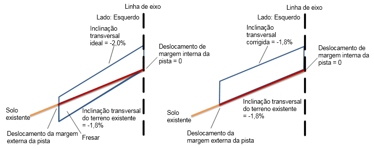 O valor definido para a inclinação transversal corrigida é sempre igual ao valor definido para a inclinação do solo existente.