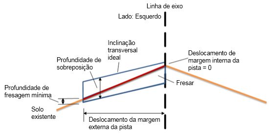 A inclinação transversal e os ajustes de elevação corresponderão ao Nível mínimo e/ou à Profundidade mínima da fresagem. A base é a superfície existente.