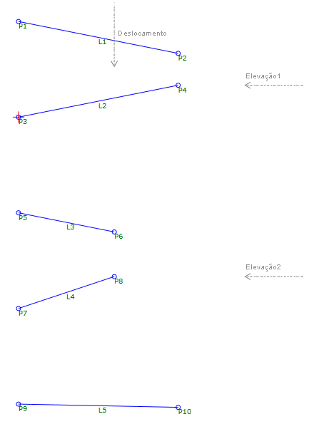 No diagrama, cada exemplo é construído em uma sequência separada. Para rever os parâmetros, selecione a inclinação e o ponto Delta X na sequência apropriada e, a seguir, visualize a seção Propriedades da geometria do ponto seção do painel Propriedades.