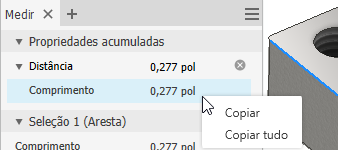 Para adicionar medições lineares, de área, de volume, de massa e/ou de ângulo à seção Propriedades acumuladas: faça uma seleção na janela de desenho e, em seguida, clique no sinal de mais ao lado do tipo de medição. Por exemplo, selecione uma linha na janela de desenho e clique no sinal de mais ao lado da medição. Em Propriedades acumuladas, o valor é adicionado ao grupo de medições Distância.