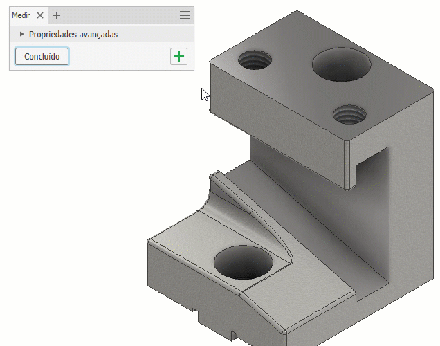 Faça quantas seleções quiser na janela de desenho e clique no sinal de mais ao lado do tipo de medição apropriado no painel Medir para adicionar valores a um grupo acumulado. Os valores são exibidos no grupo de acumulação específico ao tipo de medição. Por exemplo, em Propriedades acumuladas, um raio é adicionado ao grupo Distância e um ângulo é adicionado ao grupo Ângulo.
