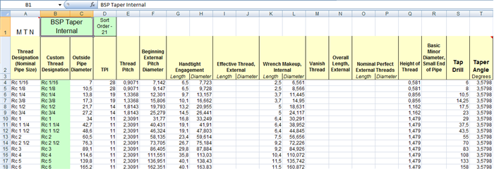 A planilha Thread.xls contém várias folhas em um destes dois formatos: Tipo de Rosca Paralela ou Tipo de Rosca Cônica. A planilha contém alguns tipos de rosca e tamanhos de furos roscados padrão da indústria. É possível editar as planilhas para: