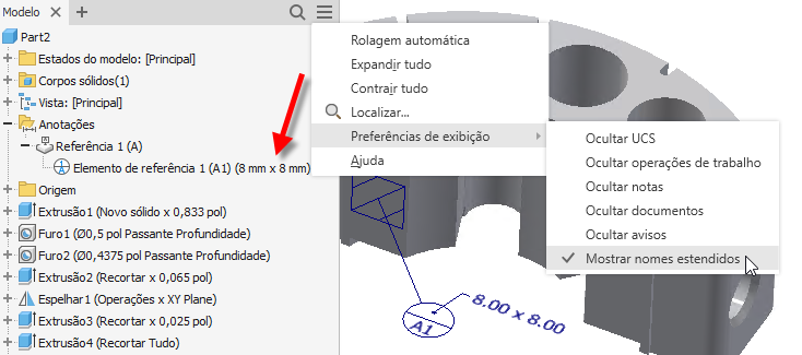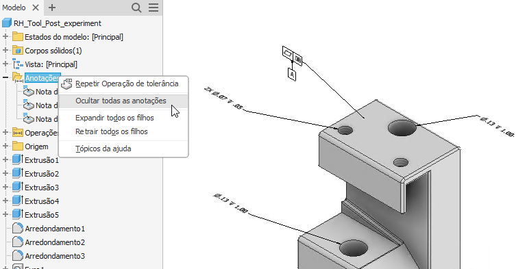 Todas as anotações 3D são inseridas em uma pasta no navegador do modelo. Todas as anotações 3D podem ser ocultadas ao Ocultar todas as anotações no menu de contexto da pasta.