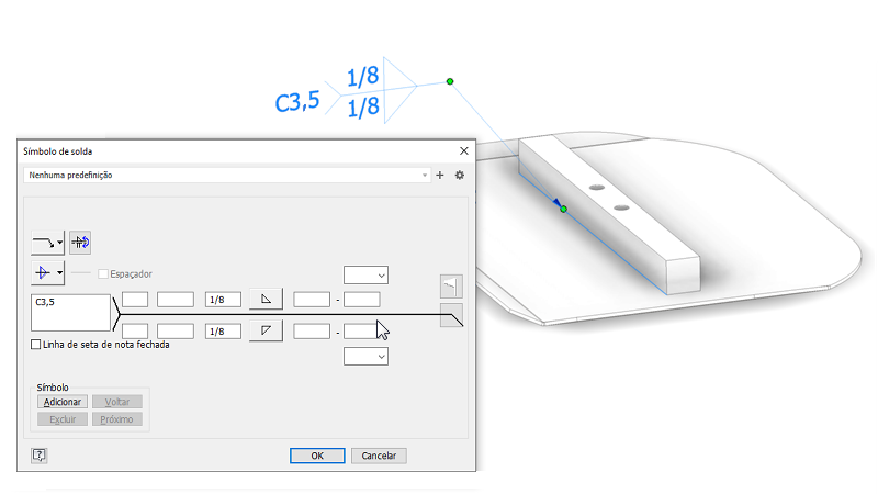 Os símbolos de solda 3D agora estão disponíveis como um dos tipos de anotação 3D. Crie e edite símbolos de solda e de subsolda em um modelo de peça ou montagem. Em seguida, recupere os símbolos associativos nos desenhos. Os símbolos de solda 3D são incluídos nas exportações para PDF 3D, DWF e Vistas compartilhadas.