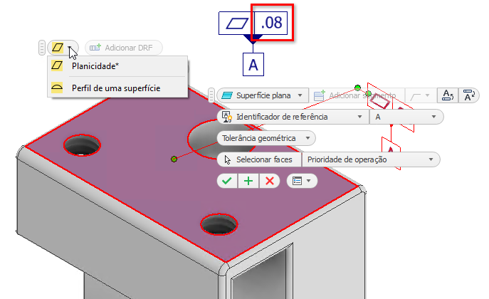 O modificador de requisito de envelope agora está disponível para notas de furo e cotas. Na visualização da anotação, clique em uma cota e, na barra de ferramentas, selecione o modificador de envelope.