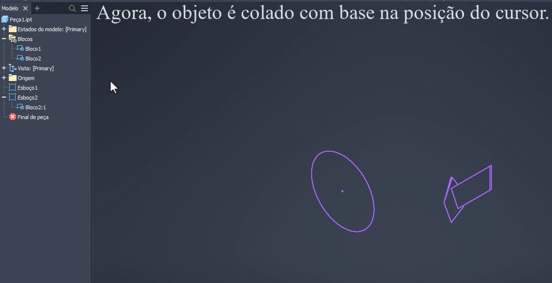 Quando você copia e cola a geometria e os blocos do esboço, a localização da colagem corresponde à localização do cursor. O centro do conjunto de seleção é colocado na localização do cursor.