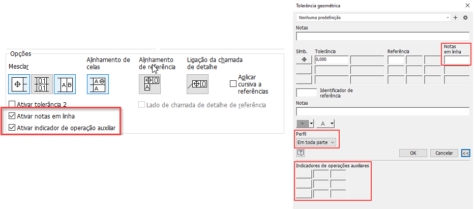 Tolerância geométrica: o símbolo "Em toda parte" na tolerância geométrica. Use a nova opção "Em toda a a parte", localizada no menu suspenso Perfil da caixa de diálogo Tolerância geométrica.