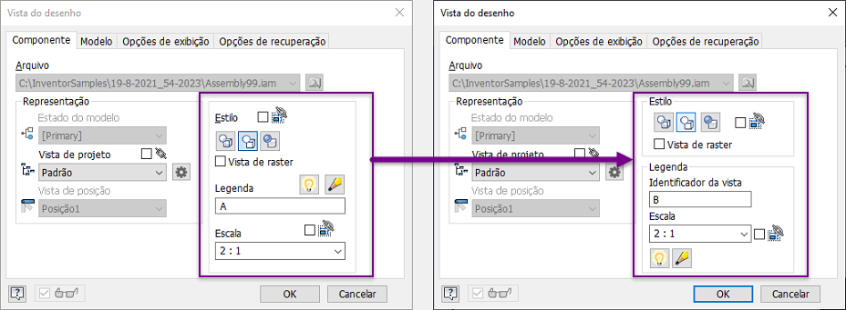 A caixa de diálogo Vista de desenho tem uma interface de legenda de vista atualizada.