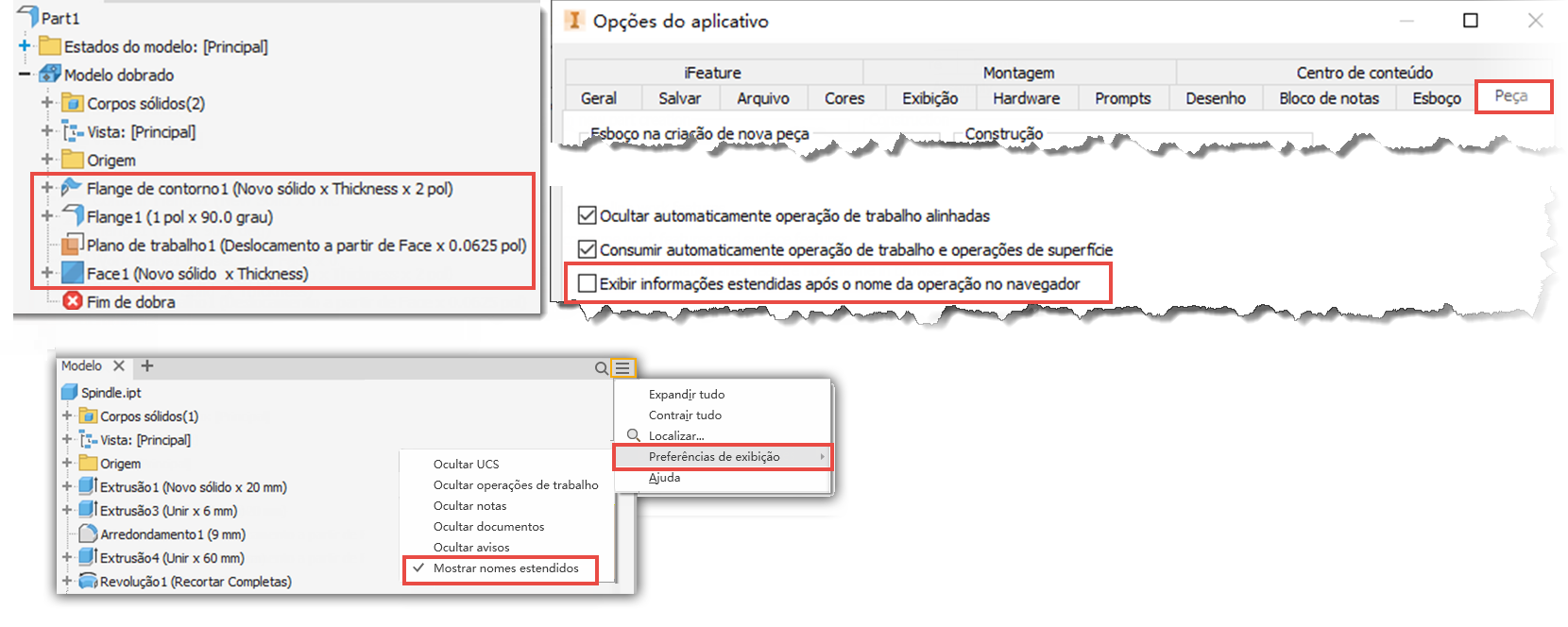 Chapa: as informações estendidas do navegador estão disponíveis para peças de chapa de metal. A opção pode ser ativada em Opções do aplicativo > guia Peça ou no nó do navegador.