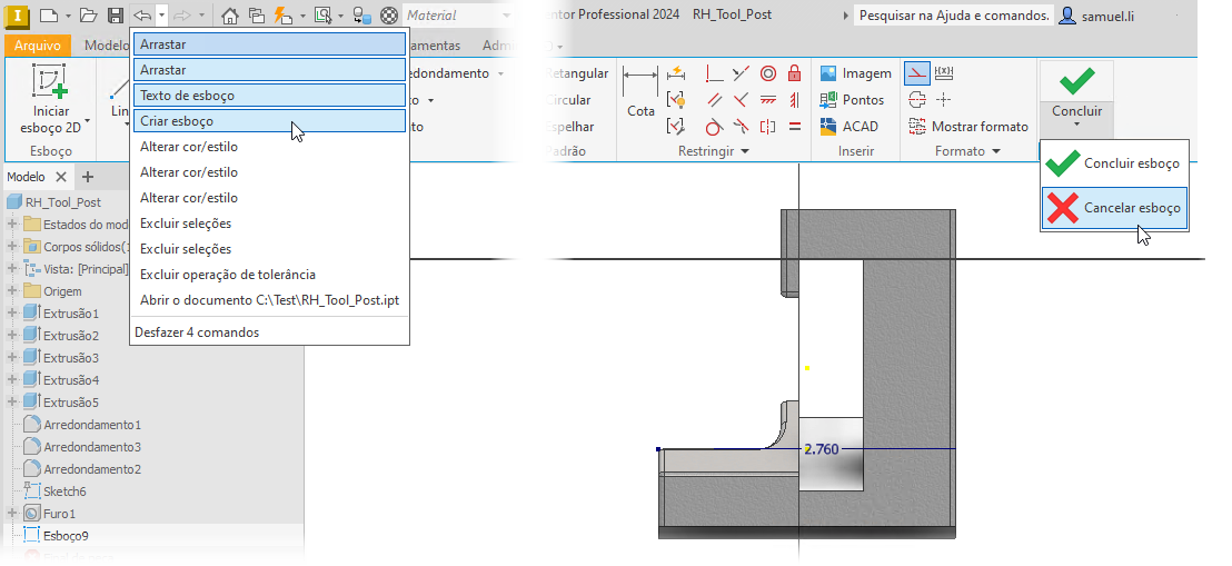 Cancelar esboço é o equivalente a desfazer todas as ações de volta para a criação ou edição atual do esboço. As listas Desfazer/Refazer são preenchidas com as ações.
