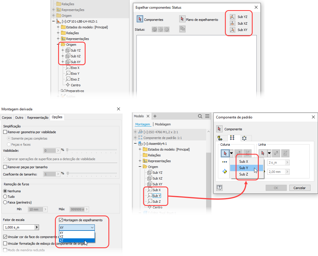 Agora, os nomes personalizados atribuídos às operações de trabalho de origem são reconhecidos e preenchem as diversas caixas de diálogo utilizadas para comandos como Componentes de espelhamento, Componente de padrão e Montagem derivada.