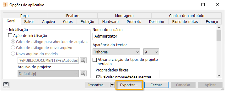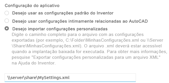 | Na caixa de diálogo Opções do aplicativo, clique em Exportar. A exportação salva em um arquivo .xml as Opções do aplicativo atuais e as configurações da caixa de diálogo Configuração do iLogic. | Ao criar a implantação, selecione Desejo importar configurações personalizadas e insira o caminho para o arquivo .xml exportado. |