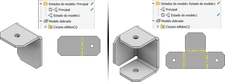 As peças de chapa de metal também se beneficiam dos Estados do modelo. Usando os Estados do modelo, é possível criar configurações com operações dobradas e planificações exclusivas.