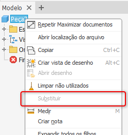 Sempre que uma peça ou montagem é criada como substituta, utilizando derivar ou simplificar, o componente resultante recebe o status substituto. O status substituto é exibido no menu de contexto do componente.