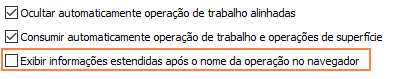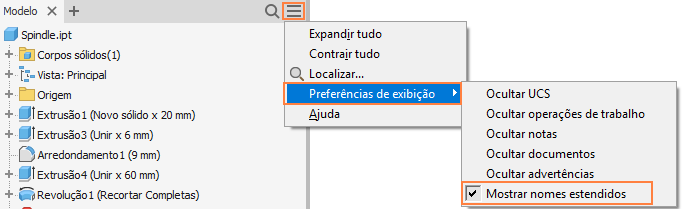 As opções "Exibir informações estendidas após o nome da operação no navegador" (disponível em Opções do aplicativo > guia Peças) e "Mostrar nomes estendidos" (disponível no menu da ferramenta no navegador do modelo) foram aprimoradas para oferecer suporte aos seguintes comandos: