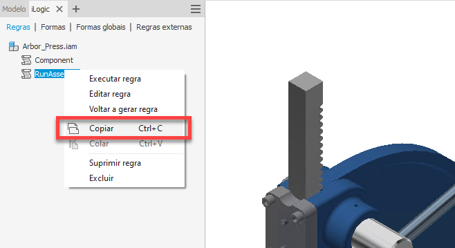 Agora está muito mais fácil copiar e colar regras no navegador do iLogic. É possível selecionar a regra do iLogic diretamente no navegador, usar o comando Copiar do menu de contexto e colar a regra em outra peça ou montagem.