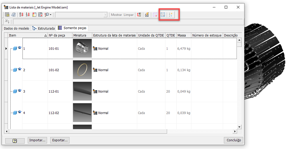 A caixa de diálogo Lista de materiais foi reprojetada. Duas opções para mostrar ou ocultar itens com quantidade zero foram adicionadas diretamente à barra de ferramentas. Use a nova alternância Ocultar/mostrar linhas com quantidade zero na barra de ferramentas. Quando ativo, você também pode renumerar a ordem sequencialmente usando a nova alternância Renumeração automática sequencialmente.