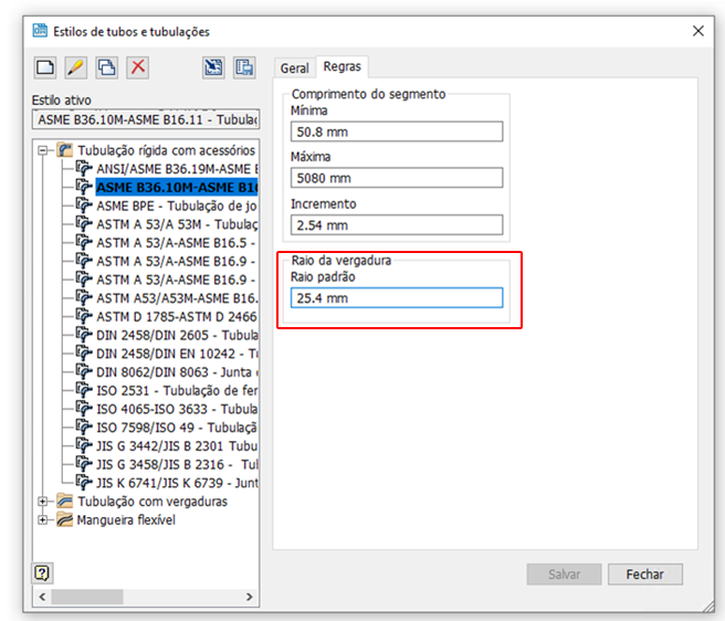 Agora, todos os valores padrão do raio da dobra são salvos no estilo exportado de tubos e tubulações. O raio de dobra no estilo T e P pode ser exportado para o arquivo XML e também pode ser importado.