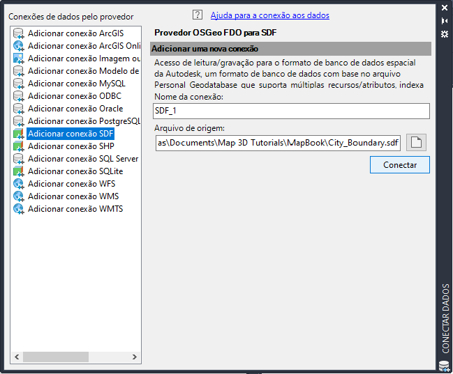 - Em Arquivo de origem (à direita), clique no botão Procurar e navegue até o arquivo de amostra City_Boundary.sdf. Clique em Conectar.