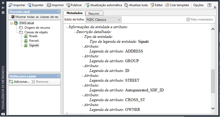 Se um desenho contiver objetos classificados, seus metadados são automaticamente gerados e exibidos ao abrir o Visualizador de metadados pela primeira vez.