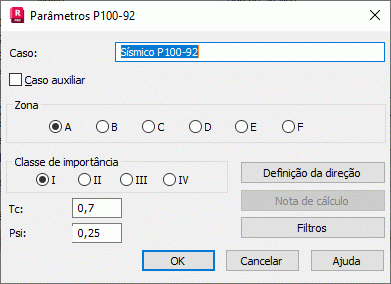 Os parâmetros de uma análise sísmica da estrutura dependem de uma norma sísmica usada durante os cálculos de uma estrutura influenciada pelo impacto sísmico. Selecione a norma sísmica romena P100-92 na caixa de diálogo Nova definição de caso ou clique em Parâmetros na caixa de diálogo Tipo de análise.