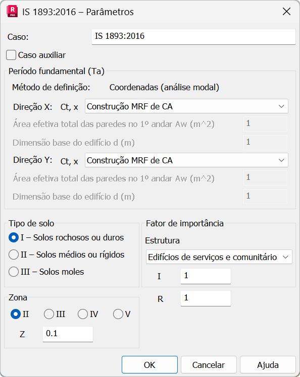 Para concluir a análise sísmica de acordo com as regras fornecidas nessa norma, defina os seguintes parâmetros: