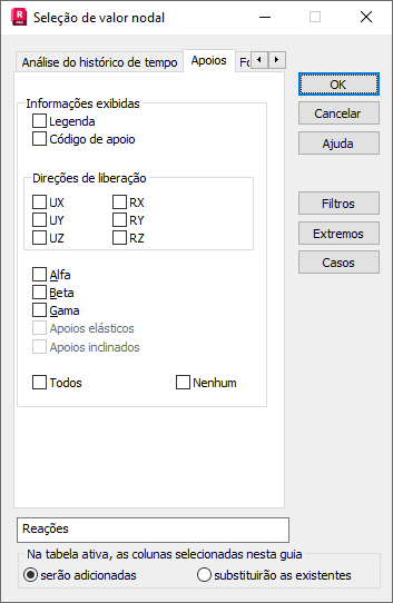 Selecione a guia Apoios na caixa de diálogo Seleção de valor nodal para selecionar os parâmetros de apoio para apresentação.