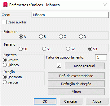 Os parâmetros de uma análise sísmica da estrutura dependem de uma norma sísmica usada durante os cálculos de uma estrutura influenciada pelo impacto sísmico. Selecione a norma sísmica de Mônaco na caixa de diálogo Nova definição de caso ou clique em Parâmetros na caixa de diálogo Tipo de análise.