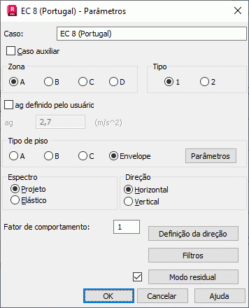 Os parâmetros de uma análise sísmica da estrutura dependem de uma norma sísmica usada durante os cálculos de uma estrutura influenciada pelo impacto sísmico. Selecione a norma sísmica EC 8 – Portugal (requisitos adotados para a Europa e apresentados no Eurocódigo 8) na caixa de diálogo Nova definição de caso ou clique em Parâmetros na caixa de diálogo Tipos de análise.