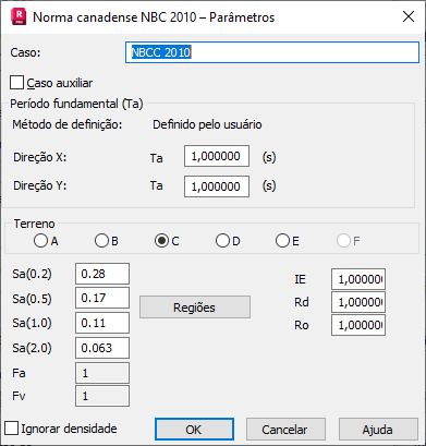 Os fatores (Sa(0,2), Sa(0,5), Sa(1,0), Sa(2,0), Fa e Fv) dependem da província selecionada e devem estar em conformidade com a Tabela C-2.