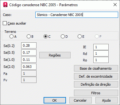 Os parâmetros de uma análise sísmica da estrutura dependem da norma sísmica usada durante os cálculos de uma estrutura influenciada por cargas sísmicas. Selecione a norma sísmica canadense NBC 2005 na caixa de diálogo Nova definição de caso ou clique em Parâmetros na caixa de diálogo Tipo de análise.