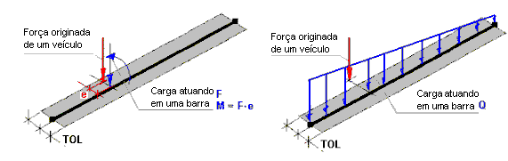 Essa opção está diretamente relacionada ao parâmetro Tolerância, descrito anteriormente. O momento originado pela excentricidade da força concentrada F será gerado somente se a força concentrada for posicionada a uma distância de um membro menor do que a tolerância assumida (TOL < e). A força concentrada F e o momento concentrado M = F*e são aplicados a um membro (observe a seguinte imagem).