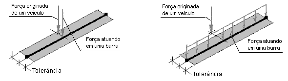 A tolerância de cargas móveis é um parâmetro atribuído a um caso de análise de carga móvel definido. Ele determina as condições para a geração de cargas em membros originadas de um veículo. A tolerância define a distância máxima em relação a um membro, para o qual uma força concentrada determinada na definição de um veículo é aplicada diretamente a um membro sem distribuir as forças nos membros (consulte as imagens a seguir: a imagem à esquerda mostra uma força que está dentro do intervalo, que determina a distância máxima em relação a um membro; no entanto, à direita, é exibida uma força aplicada além desse intervalo e essa força está sendo distribuída nos membros da estrutura).