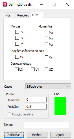 O diagrama é gerado somente para um único valor de resultado. Essa quantidade deve ser selecionada em uma das guias disponíveis da caixa de diálogo (o número de guias depende do tipo de estrutura analisada: estrutura, placa, entre outras). Além disso, um elemento (barra) ou nó para o qual o diagrama é exibido deve ser determinado. Para as quantidades apresentadas para elementos de barra, o campo Posição está disponível para determinar as coordenadas relativas em uma barra para a qual os resultados são salvos. Para elementos planos, os valores de forças e tensões são lidos nos centros dos elementos.