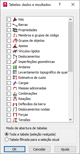 A caixa de diálogo Tabelas: dados e resultados permite selecionar tabelas para a apresentação de dados ou os resultados do cálculo.