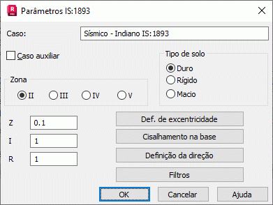 Os parâmetros de uma análise sísmica da estrutura dependem de uma norma sísmica usada durante os cálculos de uma estrutura influenciada pelo impacto sísmico. Selecione a Norma sísmica indiana (IS 1893) na caixa de diálogo Nova definição de caso ou clique em Parâmetros na caixa de diálogo Tipo de análise.