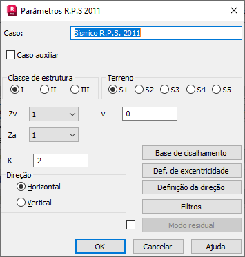 - Vá para a seção Cargas e selecione R.P.S. 2011 no menu Cargas sísmicas.