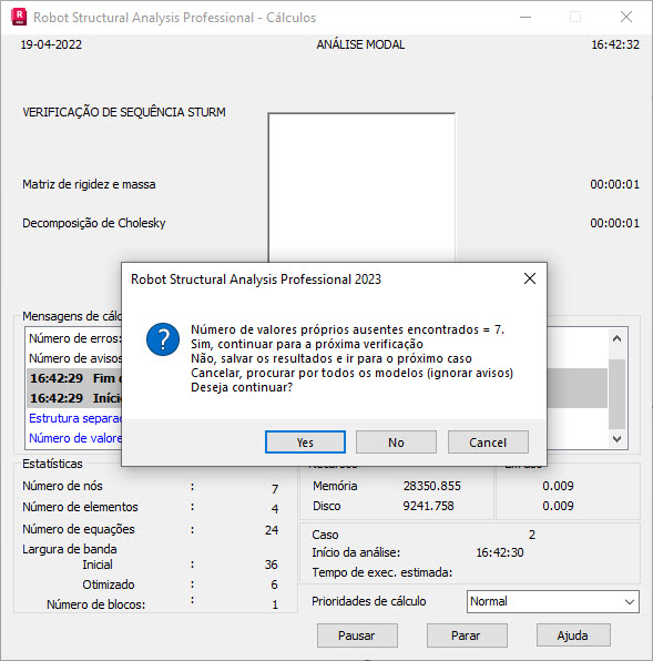 Se a análise modal estiver selecionada e a porcentagem de massa para um número máximo de nós especificado for menor do que o necessário, um prompt avisará sobre a porcentagem de massa insatisfatória enquanto os cálculos continuarem sem correções.