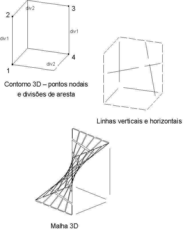 É possível aplicar a criação de malha Coons a domínios planos (2D) onde os contornos são definidos em planos (consulte o desenho acima), bem como a superfícies 3D onde os contornos são definidos no espaço (consulte o desenho abaixo).