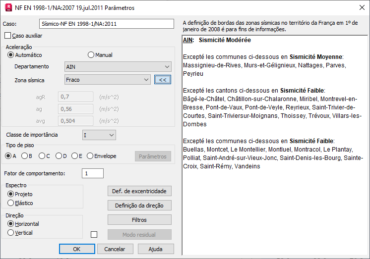 Após selecionar essa norma, a geração de cargas sísmicas será baseada nos requisitos provisórios da norma NF EN 1998-1/NA:2010p, ainda não liberados.