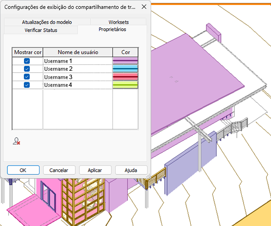 Configurações de exibição do compartilhamento de trabalho. A cor especificada do proprietário correspondente é exibida no modelo.
