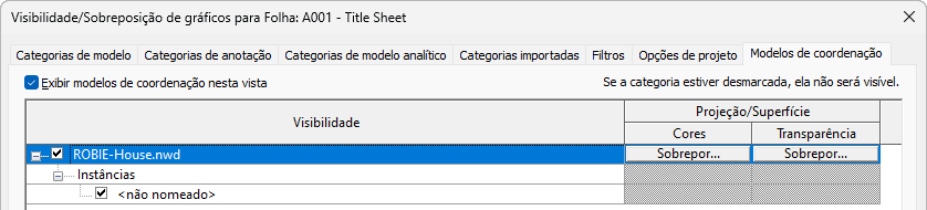 Após vincular um modelo de coordenação a um modelo do Revit, use a caixa de diálogo Visibilidade/Gráficos para definir a visibilidade e transparência. Use a configuração da transparência para distinguir o modelo de coordenação do modelo do Revit.