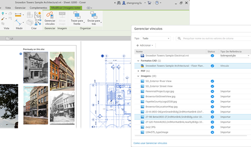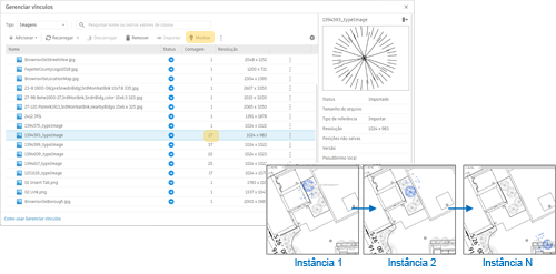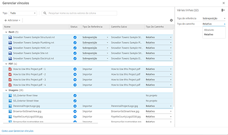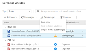 A nova caixa de diálogo Gerenciar vínculos mostra todos os formatos CAD dos arquivos vinculados e somente os formatos DWG, DXF, DGN, SKP, AXM CAD importados dos projetos e famílias.